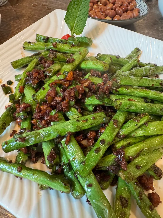 經典川菜風味,豆角煸炒至微焦,搭配肉末和辣椒,鹹香微辣,能平衡烤鴨的油膩感。