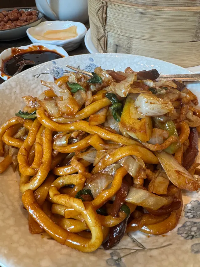 濃油赤醬的上海風格,麵條粗韌有嚼勁,搭配蔬菜和肉絲,飽足感強。