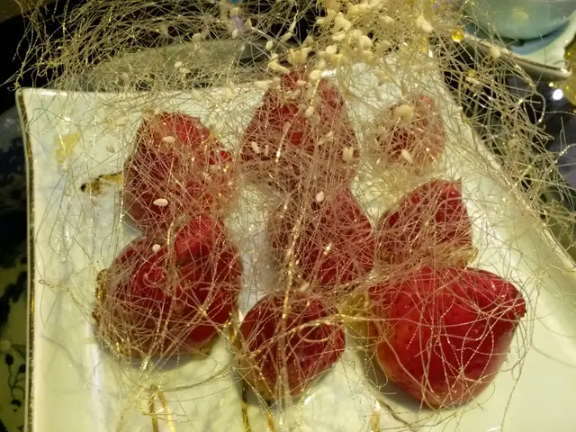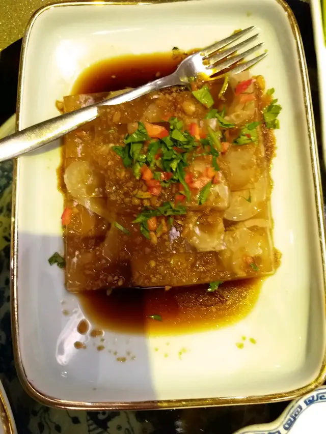甜品呢!這裏最出名北京填鸭,叫左半隻,唔算太肥,幾好食!冷盤有豬皮凍,幾特别,好爽口!另外一客雞粉皮,味道不錯。還有紅燒牛肉麵,這个較差,味道一般!😏最後拔丝士多啤梨