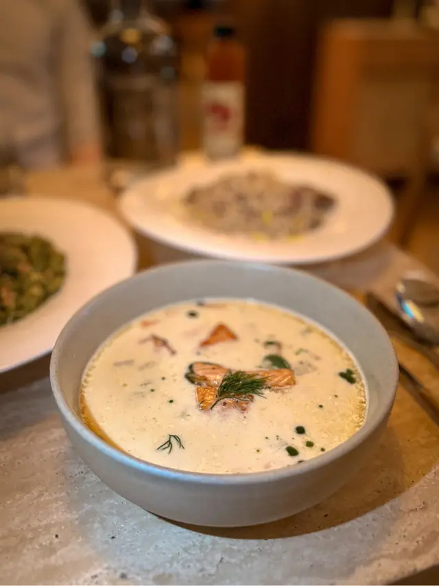這道挪威魚湯,帶有微微的奶香與蘿蔔的獨特氣息。搭配些許蔬菜和蒔蘿點綴,增添清新感。