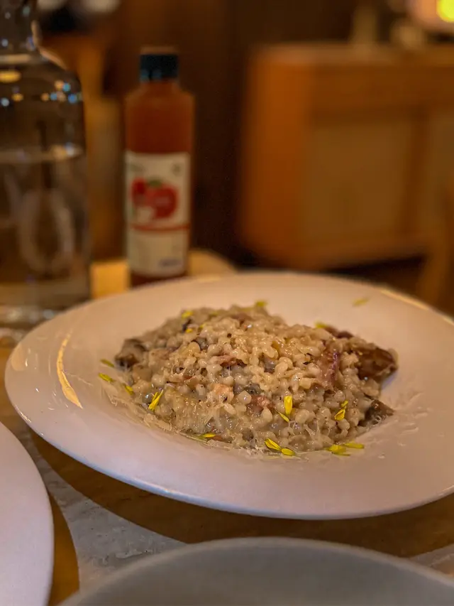 油封鴨大麥燉飯是一道充滿創意的料理。有別於傳統義式燉飯的奶油感,用了糙米更為Q彈,帶有穀物的自然甜味。 油封鴨分布喺燉飯之中,鴨香融入其中。