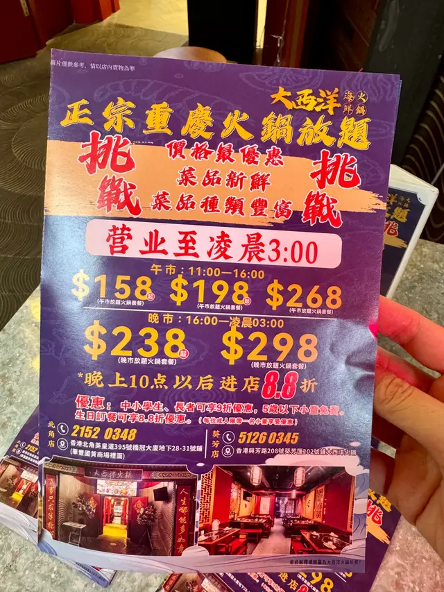北角即撈任食海鮮 性價比高重慶火鍋 foodiez.laLevel 42025-09-08100 views Follow 隨友人來到超高性價比火鍋店,位置就在北角站附近,非常方便,裡面可以自己撈海鮮,全部新鮮跳彈,每位$298海鮮包括三點蟹,鮑魚,羅氏蝦,花螺等,撈起仍在鮮活跳動,看得到的新鮮,交由廚房清潔後便可開動牛肉方面有牛板腱等,肥瘦適中,每次點完都極速上桌,我們吃了8盤外面有大量火鍋配料,包括丸類,菇菌,多款菜類飲品除了常見的汽水和茶類,還有椰青水和數款啤酒任飲,輕鬆回本最後以甜品作結,選了脆皮Mega雪條店員告知10點後是宵夜時段,有88折,超值之選The above review is the personal opinion of a user which does not represent OpenRice's point of view.LikeShare大西洋海鮮火鍋 https://s.openrice.com/QrKT0gr1U00Report Post Ratings5Taste5Decor5Service5Hygiene5ValueDining MethodDine In