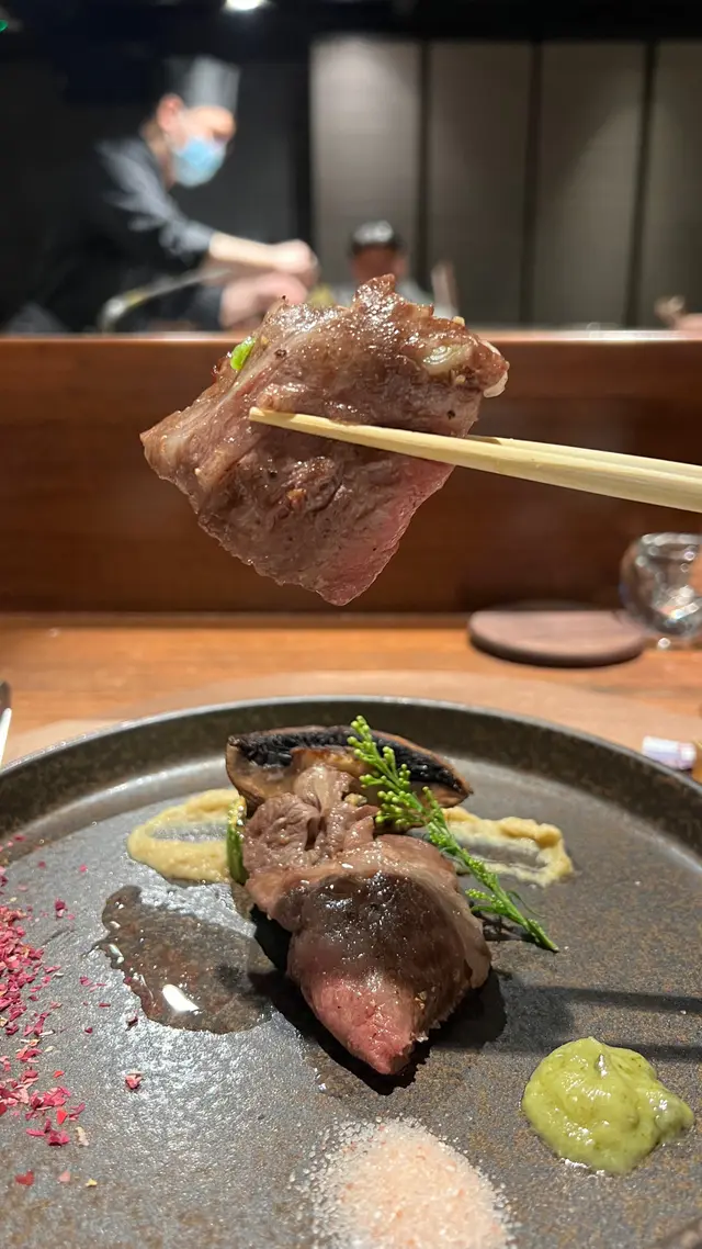 和牛中間包著大量的香蔥和蒜,和牛的油香留在口腔中,使人非常回味。另外主廚配搭了,茄子慕絲、鹽和藤椒醬油,可解和牛的油膩。