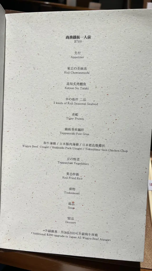 上星期朋友生日,預約了這間在北角的鐵板燒店,天氣好冷,入座後店員立即貼心地送上熱茶。我們叫了$788 一位的商務鐵板一人前,內容很豐富!
