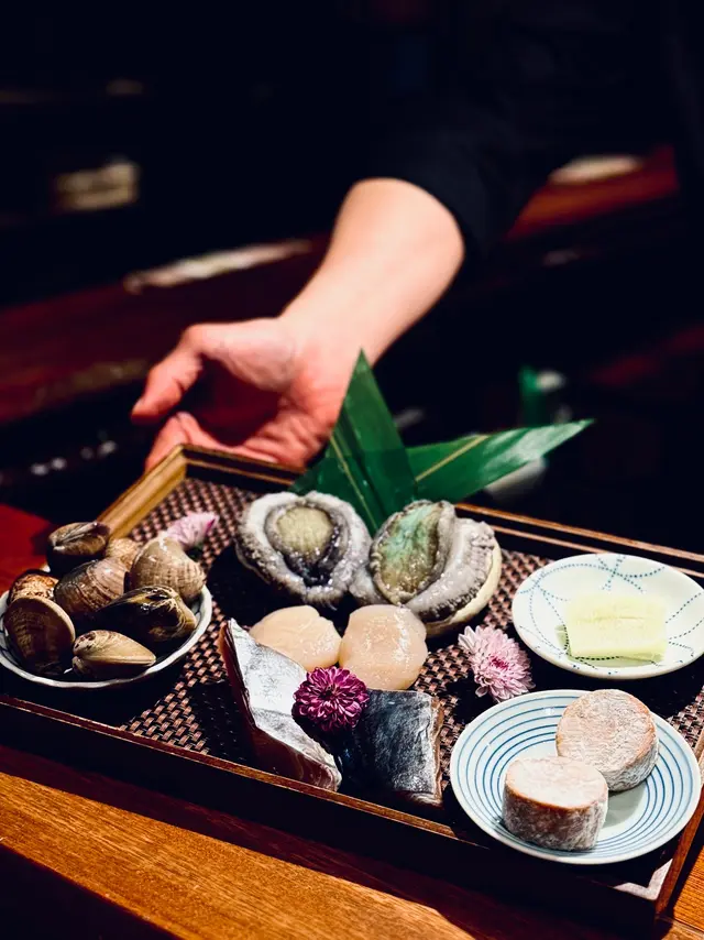 師傅率先奉上北海道帆立貝,用上忌廉枝及枝豆汁的配搭令鮮味提昇,帆立貝入口鮮嫩帶甜,很不錯,然後下一道便是牛油清酒煮蜆,在我們面前用錫紙盤點火煮酒烹調,過程一氣呵成,火光四射,非常吸睛,最特別是師傅加上了芫荽酒及辣椒絲調味,令湯頭更為惹味暖身,很滿足。