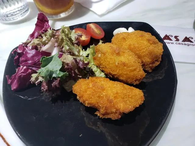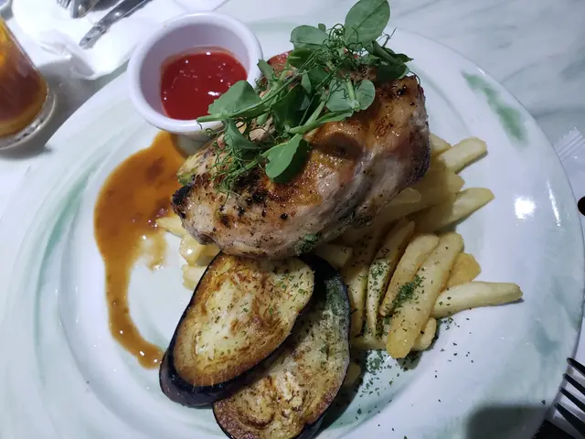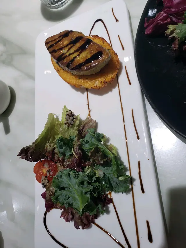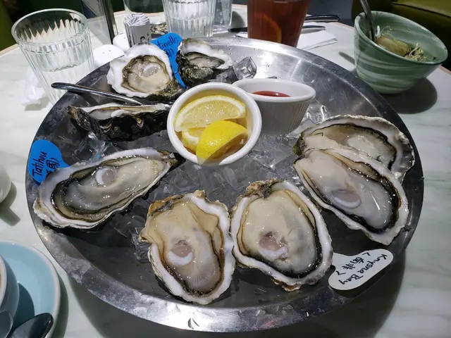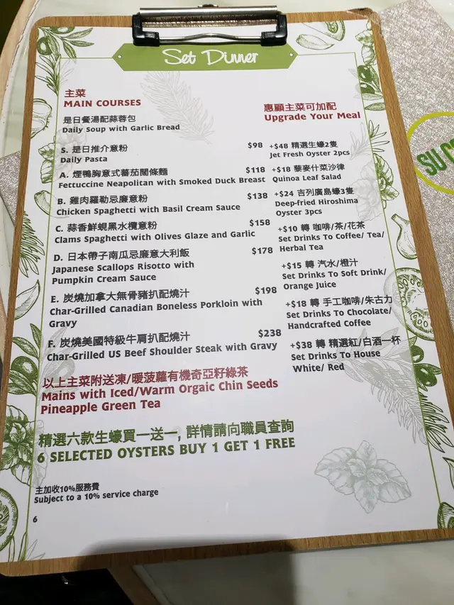 主食,我們叫了帶子南瓜忌廉意大利飯(好好味)、無骨豬扒配薯菜,另叫了8隻生蠔(有4隻跟餐加錢點的。/有4隻額外點的,買一送一)、炸蠔、香煎鴨肝配多士Share嚟食。