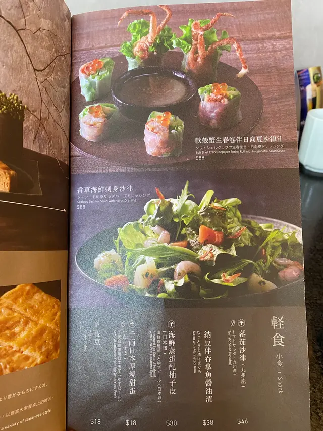呢個軟殼蟹生春卷伴日向夏沙律汁我想試好耐。軟殼蟹生春卷一客6件,薄薄卷皮包住好脆口嘅炸軟殼蟹,生菜片,青瓜絲同少少牛油果,上面加左三文魚籽。伴碟有日向夏沙律汁,味道甜甜酸酸而有粒粒脆脆果粒咬吓。食落又薄又脆又新鮮,有多重口感。