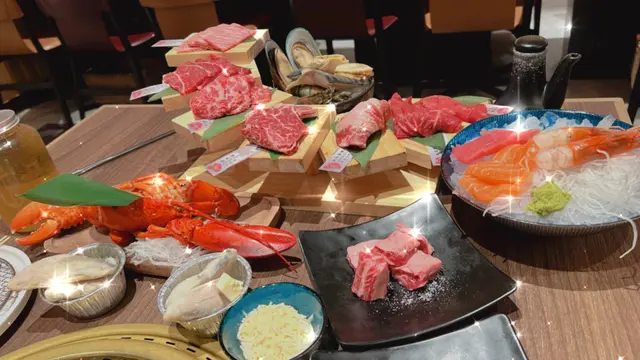 一入座員工已經放了 九州和牛西冷一碟 7款和牛樓梯級加海鮮拼盤 和 一碟芝士龍蝦