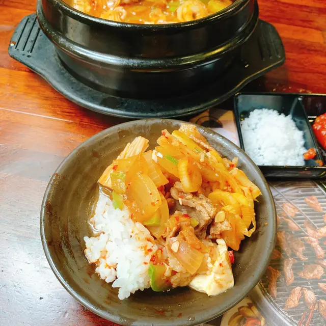 我呢?來喜來食燒肉已食過幾次,今日想清淡些,所以叫了個午市套餐:海鮮牛胸肉大醬湯。湯底非常濃郁,有蟹、蜆、牛肉、豆腐、金菇等,用來做湯飯好好味,雖然每樣都只係少少,但食完碗飯都夠飽了。