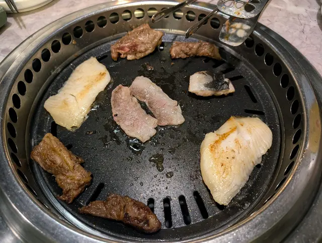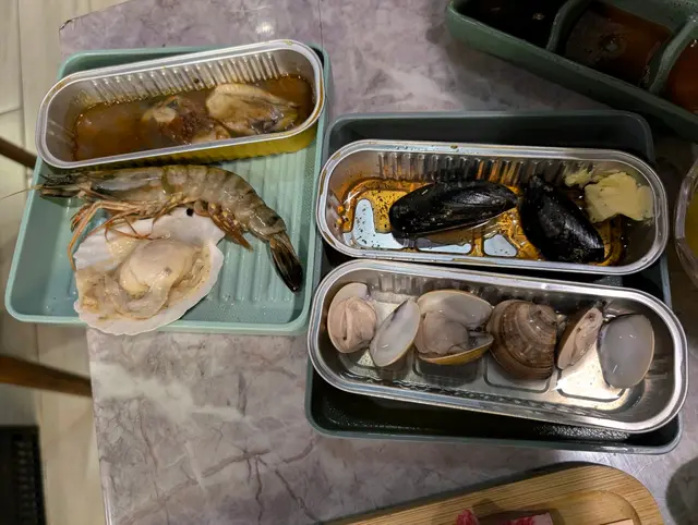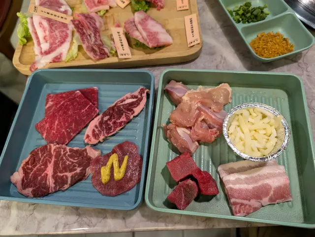 一坐低已經會送上呢個餐頭盤,有和西冷、鮑魚、比目魚西京燒、韓風醬油牛肋肉、味淋魚干仲有一盆和牛拼盤。而和牛是可以無限追加的。其他食物就用qr code網上落單。頭盤中最喜歡嘅係A4黑毛和牛後腰肉同三角腩,呢兩個部位油脂特別多,入口即溶化,好美味!另外試左澳洲M5和牛,崩沙腩及外腿肉兩個部位都好食。另外點左一啲海鮮如虎蝦、青口、蜆、扇貝、廣島蠔,肉類有一口牛、豚拖羅及mozzarella 芝士雞腿肉,燒熟嘅雞腿肉再沾上錫紙兜內溶化嘅芝士拉絲,配搭超正!蔬菜及天婦羅都有多款。