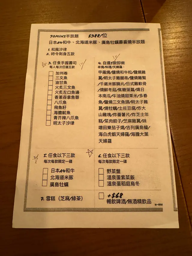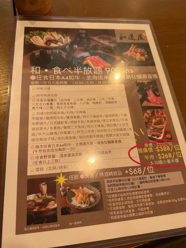 半放題都算抵食💁🏻♀️ food_pig_pigLevel 42024-05-1484 views Follow 半放題絕對夠飽‼️除咗小食樣樣都有得任加,佢啲小食係高質,難怪無得加🤓1壽司入面嘅火炙左口魚邊好出色,有入口即溶嘅感覺‼️小食入面嘅鹽燒和牛粒都好正,可以要兩串!三文魚頭都好有驚喜😍 最後就係海白虎蝦天婦羅🍤 唔厚粉,好食😋 仲有壽喜燒打邊爐,本身有粉絲菜豆腐嘅簡單配搭,之後自己任加日本A4和牛、北海道米豚同廣島牡蠣🦪 好食✌🏻和牛係真高質,不過每碟得4塊最後仲有雪糕🍦整體嚟講都幾吸引,朋友見到都話想嚟😍1The above review is the personal opinion of a user which does not represent OpenRice's point of view.LikeShare和道屋 https://s.openrice.com/QrKT0vrDJ00Report Post Ratings4Taste4Decor4Service4Hygiene4ValueDining MethodDine In