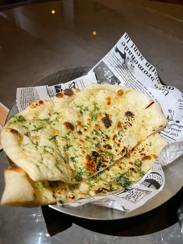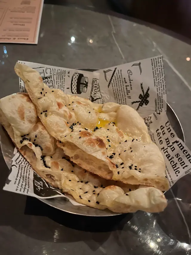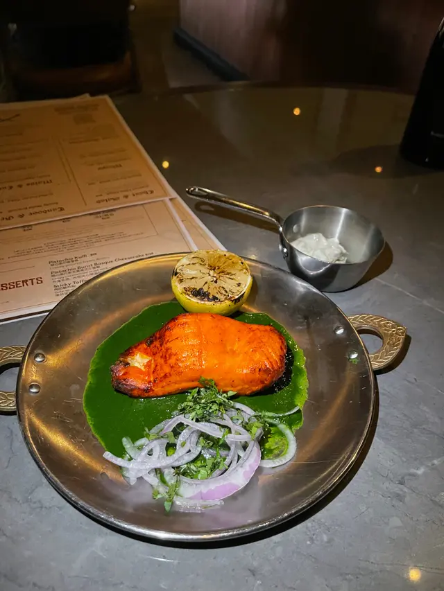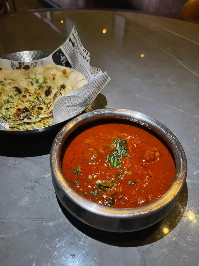 我試咗佢哋嘅烤羊肉串同三文魚,肉質嫩滑,烤得香口,配上啲清新洋蔥同青檸,味道層次豐富。特別係三文魚,表面焦香內裡juicy,配個小份青醬超正!飲品方面有個cocktail加咗肉桂,顏色靚到爆,入口酸甜帶香,解膩一流。仲有Pinot Noir紅酒,2023年份嘅,口感順滑,配菜食真係啱到fit。主菜有咖喱雞同Naan,咖喱濃郁入味,啲香料同牛油香好搶戲,而Naan烤得鬆軟,啖啖有芝麻同芫荽味,同咖喱一啖入魂!