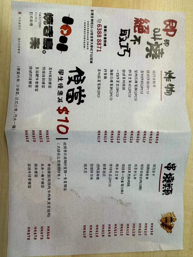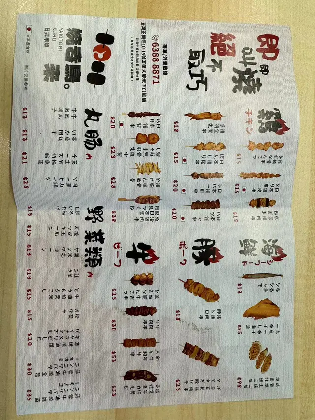餐單種類多,串燒以單點形式,有雞、牛、豬、丸腸及野菜類,