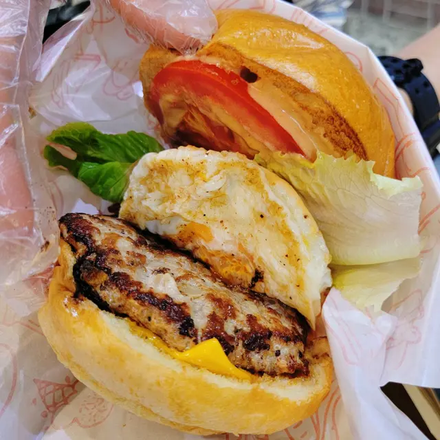 兩款漢堡的餡料都有芝士、充滿蛋香又柔軟的煎蛋、新鮮爽脆的生菜及蕃茄,當然重點是又厚又大片的手打牛肉、豬肉啦!