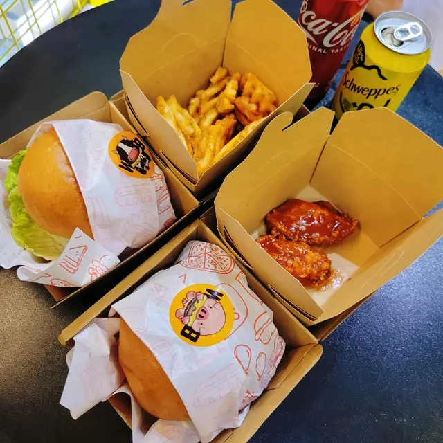 點餐後看著店員即製,十多分鐘就完成了。我們選了招牌的WB手打牛王漢堡及WB手打豬妞漢堡,看起來都十分大個;配薯格及水牛炸雞翼。