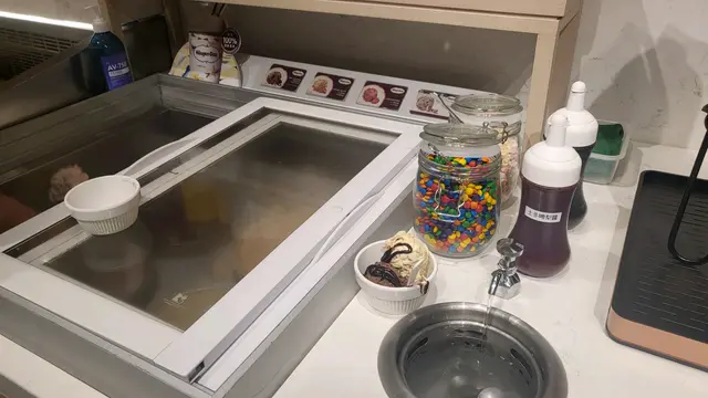 💁🏻♀️要彈一彈個雪糕櫃,成日見人𢳂雪糕要排好耐,好奇心驅使下出去八下,原來D雪糕堅硬無比,見前面位靚女為咗試齊四款口味, 費盡九牛二虎之力,勉強完成任務,由於太硬關係,好多人都係撳住個雪糕筒邊嚟𢳂,其實都幾唔衛生😑,依家好多餐廳都已轉用軟雪糕機或提供杯裝雪糕,係時候要變下
