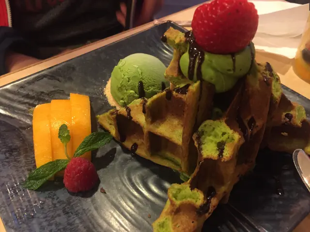 抹茶窩夫好大份(共四件窩夫),窩夫與窩夫之間有一大坨”抹茶吉士”,可以自行選擇窩夫夾抹茶雪糕食,或沾抹茶吉士。抹茶吉士質感細滑,抹茶味濃,微甜帶甘。抹茶雪榚好清甜,抹茶味亦重。綠茶甜品基本上無得輸,呢個窩夫堅抵到核爆,下午茶仲打埋8折,$40蚊鬆啲就食到,抵到喊左。