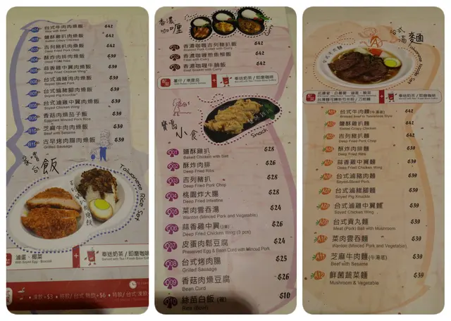 我哋喺門口等位已攞單張睇食咩, 麵食/飯類已包普通熱飲<只有奶茶/咖啡/檸茶/檸水, 好立克/阿華田竟然係無供應 :( >