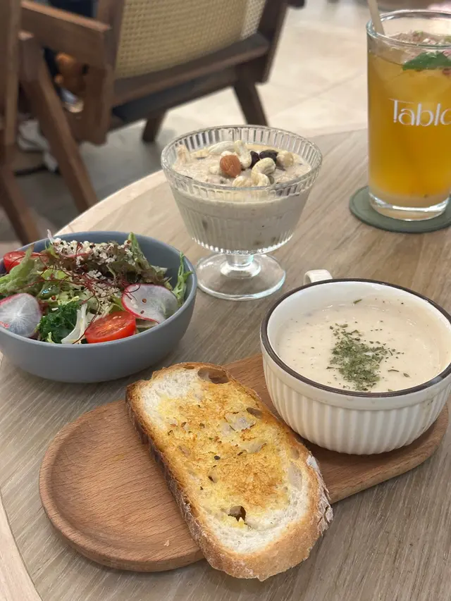 前菜我哋揀咗楓樹糖漿堅果燕麥杯,裏面有蘋果絲,而且好香豆乳味,是日餐湯係黑松露西蘭花忌廉湯,配上牛油酸種手工麵包,仲加咗個藜麥田園廚師沙律。