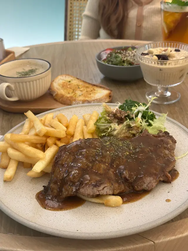 安格斯牛扒好香,雖然係薄身牛扒,但係有一個半手掌大,加上薯條同沙律其實都好飽。