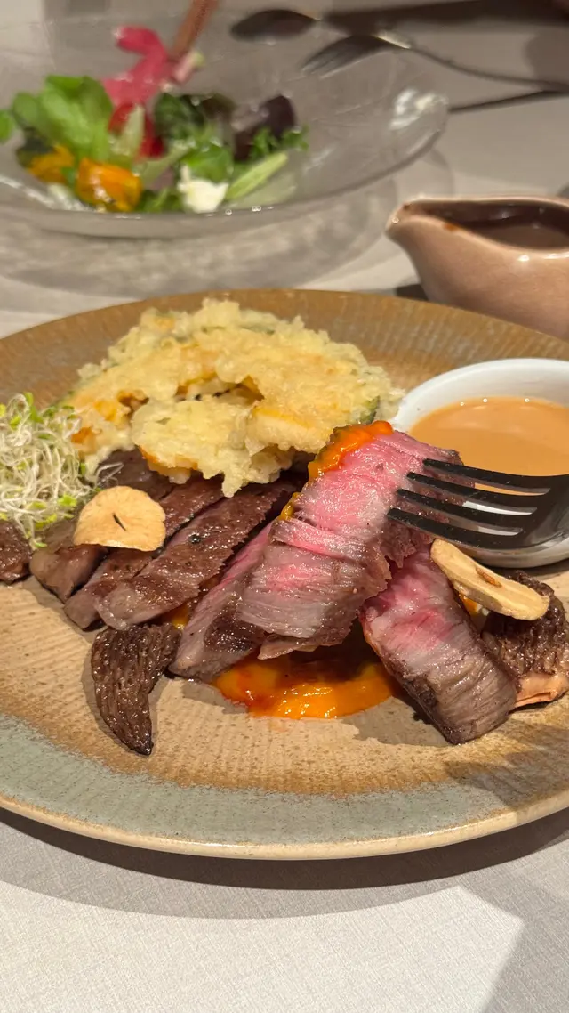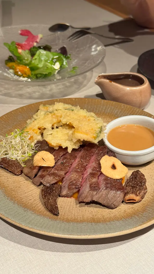 主菜1: 火炙烤A5和牛🥩半日本南瓜天婦羅