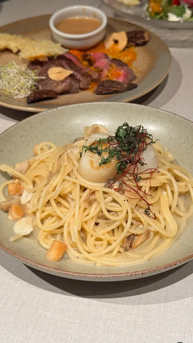 主菜2: 香煎帶子榮螺 貝柱蒜片意粉🍝
