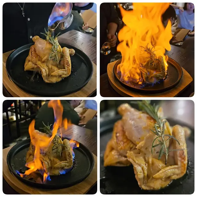 最後點上慢煮燒雞,來填飽最後的空隙!呢一道菜亦都係店長極力推介,慢煮春雞在鐵板上配上 rosemary,店員將鐵板燒雞呈上是已在座位聞到遠處的rosemary,再來幹邑鐵板上點上火,簡直係視覺享受!慢煮燒雞,雞肉滑嫩,由於慢煮,雞肉的味道所在肉內,這也很不錯!