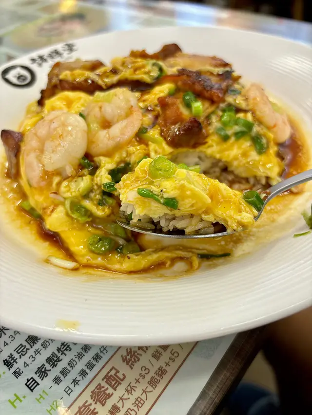 🏅叉燒蝦仁雙拼滑蛋飯+熱奶茶($66)