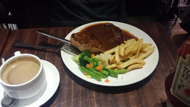 友人 原先是點了跟飯,怎知此餐廳規定晚上沒有飯可跟餐,只能點意粉,薯菜!真新穎呢!