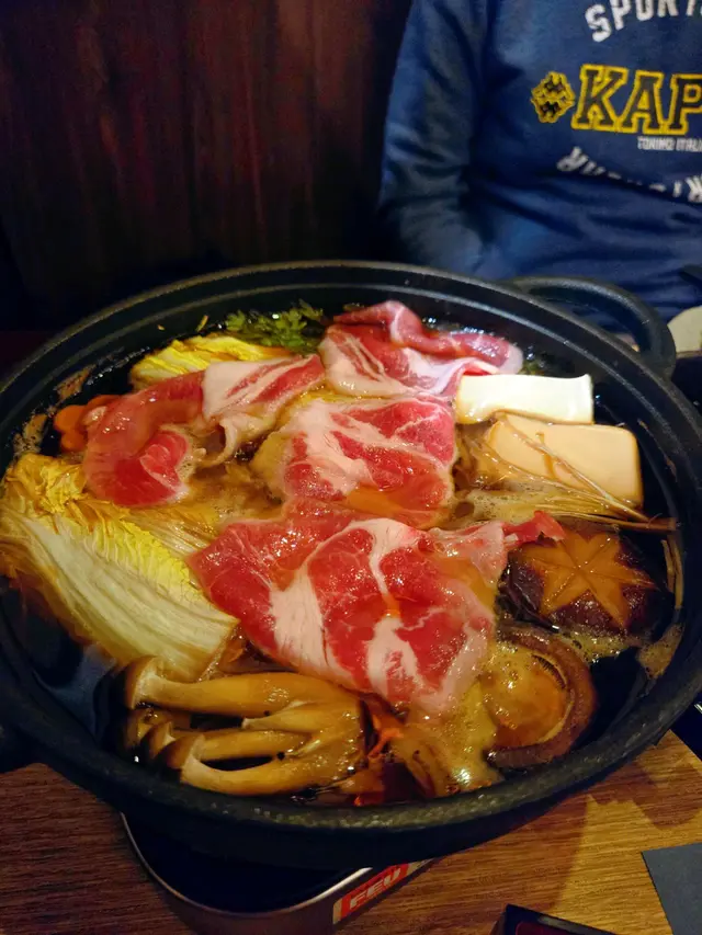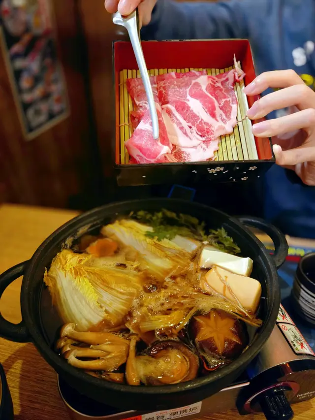 美國牛五花有雪大理石般花紋路,吸附壽喜燒甜醬湯。 鍋物含豆腐、野菜、絲,平衡肉感解膩。
