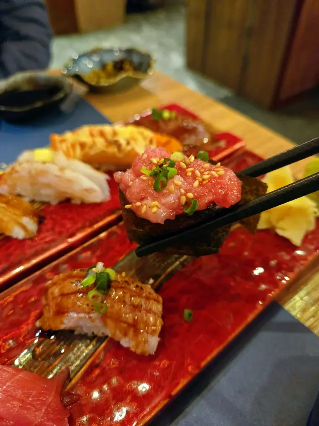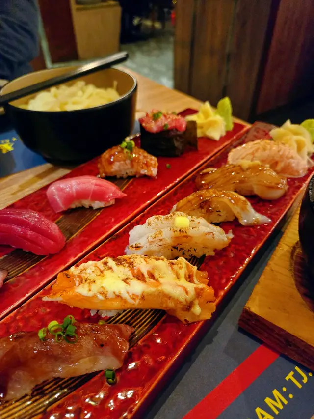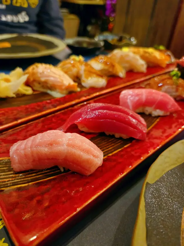 火炙三文魚油脂化開滲入飯。平目魚魚邊微捲微脆。赤蝦新鮮甜嫩,蟹柳明太子醬正常發揮。和牛壽司有好香牛香味。