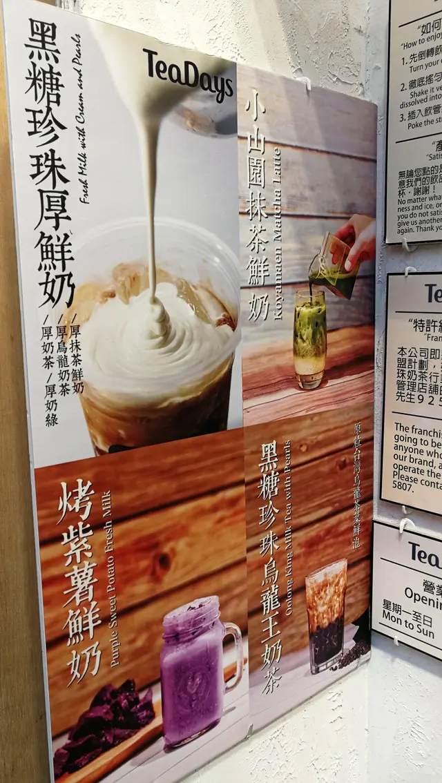 可以一試的小茶堂 lamrayLevel 32018-12-2381 views Follow 周末到旺角行街幫屋企買野,去到好景商場附近,發現一家開左一排但未有機會飲既臺式飲品點<TeaDays>~~<TeaDays>位於好景商場及馬會中間~~睇完餐牌,同鄰近其他臺式飲品點差異不大,價錢亦都差唔多~~飲品店推薦既飲品主要有<黑糖珍珠厚鮮奶>同<烤紫薯鮮奶>~~黑糖珍珠厚鮮奶$29<黑糖珍珠厚鮮奶> - 一拿上手,感覺到黑糖微暖,珍珠大小適中,夠Q而帶黑糖味,但佢既黑糖味因爲過重,反而有d將奶味蓋過。追求比例平衡既朋友,可能選擇半甜會適合d~~The above review is the personal opinion of a user which does not represent OpenRice's point of view.LikeShare可以一試的小茶堂 小茶堂 https://s.openrice.com/QrKT0Lwen00Report Post Ratings3Taste3Decor3Service4Hygiene3ValueDate of Visit2018-12-21Waiting Time5 Minutes (TakeAway)Spending Per Head$30 (Tea)