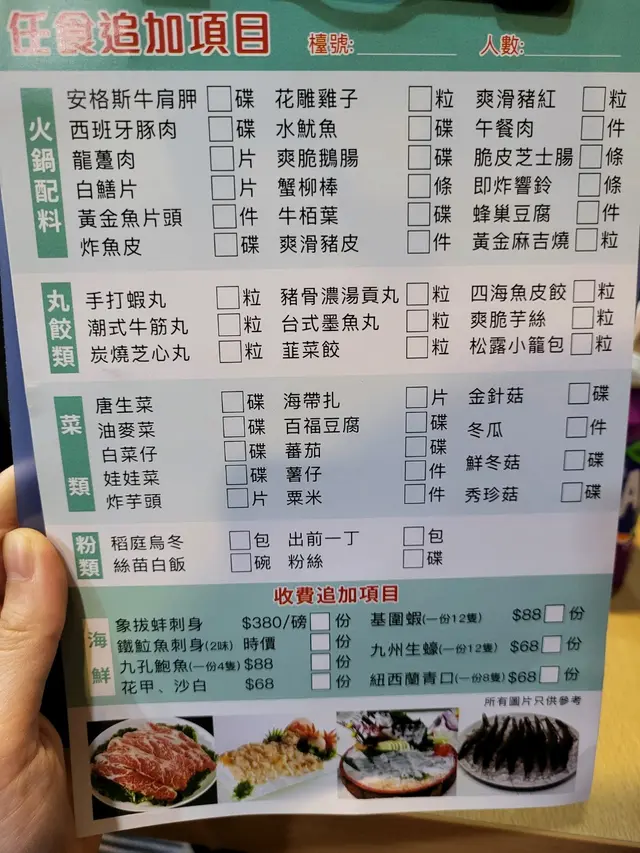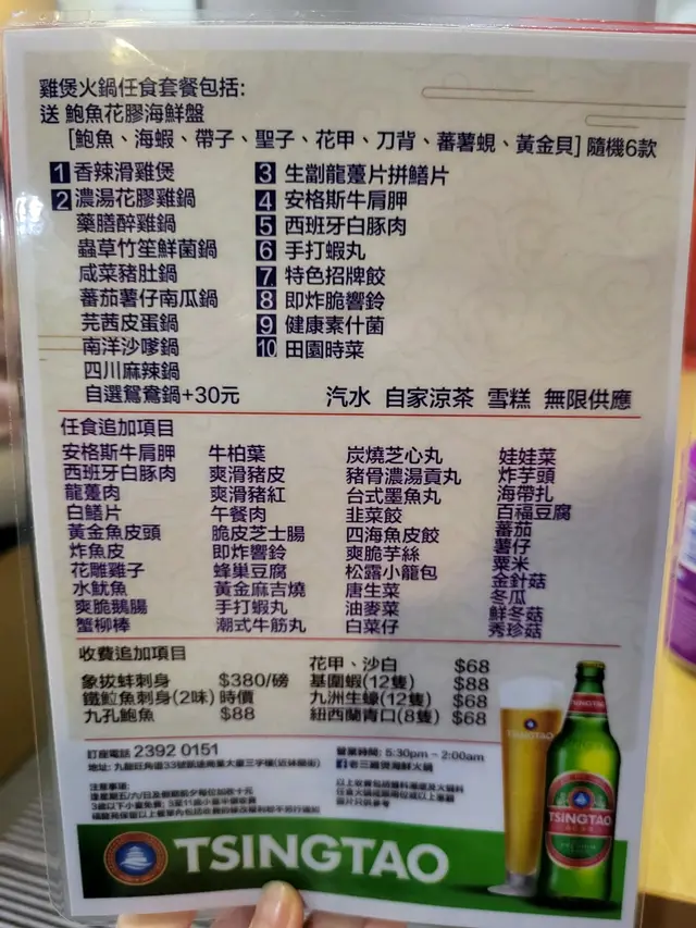 雞煲再換新湯底比你打邊爐,每枱人頭計有一盤海鮮拼盤,海鮮幾新鮮。任食的食材一般,不算特別出色,但可以接受。最好係無限時任坐。 任食食材推介龍躉肉同白鱔片,個人都中意響鈴,牛肉豬肉同其他食材就普著通通,但合格。每位272$,任食任坐,可以試一次。