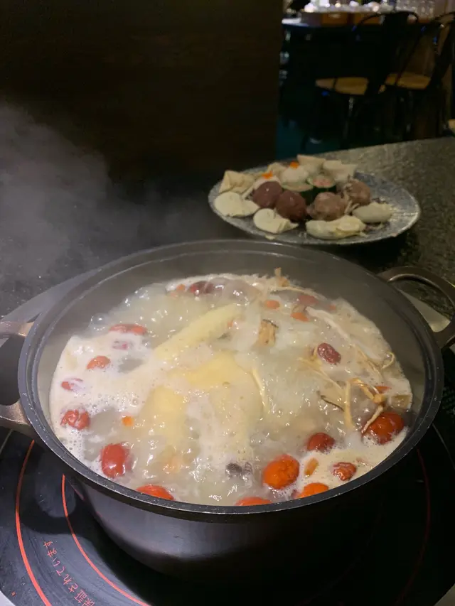 個湯底好濃郁藥材味,而且好足料,入面有花膠響、螺頭、足足半隻雞、以及人參紅棗等藥材,但係如果本身唔好藥材或者怕苦嘅話就最好揀海鮮火鍋。