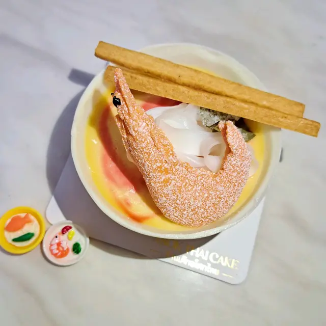 一碗冬陰功造型嘅蛋糕 [ Tom Yum $78 ] 用白朱古力整成一個碗,仲有餅乾整成一對筷子,賣相夠哂特別,隻朱古力蝦真係超似,連個味道都係冬陰功嘅湯味,真係好似飲緊碗冬陰功湯咁,味道係甜中帶辣