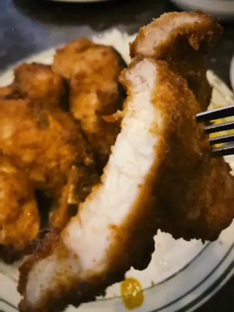 •豬扒:每碟會有兩塊大豬扒,豬扒用酥皮炸的方式處理,沒有厚厚的炸漿,自然更不會有成灘油,但外皮每次都金黃酥脆香口。帶有輕盈嘅脆度,每一口都係香而不膩。肉質非常鮮嫩多汁,不用標榜甚麼厚切不厚切,咬落去都帶俾人啖啖肉嘅滿足感。酥香嘅外皮完美襯托咗嫩滑嘅豬肉,食感非常突出。