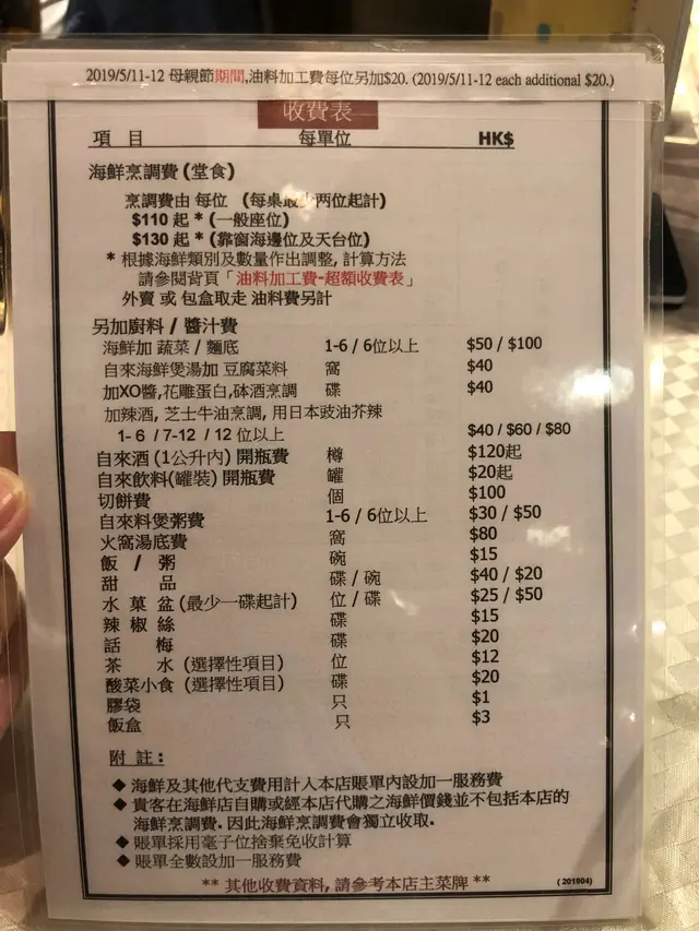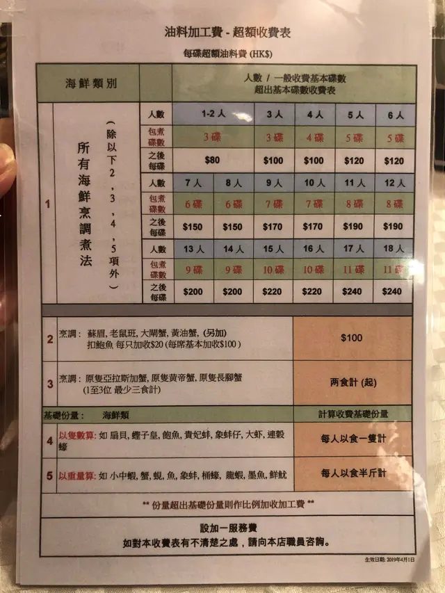 至於收費方面,南大門油料加工費列明清晰,按人數多少及海鮮類別計算,價錢合理。