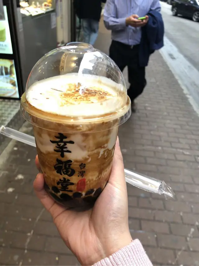 得我一個人只可以飲一杯,肯定要幸福堂Top 1 頂級焰遇幸福-黑糖珍珠鮮奶:茶味好淡幾乎無咩茶味,奶味好重,看似黑糖好多,但系甜度適中,D珍珠好煙韌,好有口感,因為用火槍燒過奶蓋和糖霜,飲的時候會有陣陣焦糖味。整體來講成杯奶茶配搭的好好,唔鐘意茶味太濃的人可以試下。