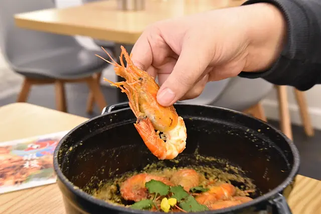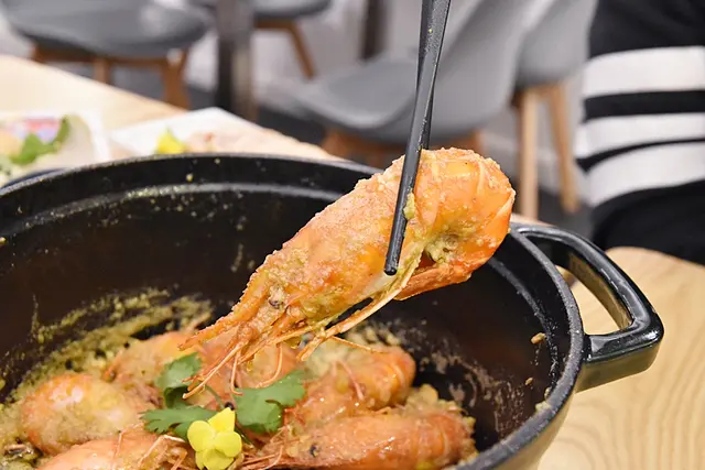 其實睇到個魚虹咁多大頭蝦都知道主打食蝦,有成十款唔同味道選擇,見到有唔少人試左奶油蝦,所以小妹就決定來個近來大熱既「鹹蛋黃」蝦。用上燙手既鑄鐵鍋上枱,裡面分別有八隻大頭蝦被鹹蛋黃圍住。