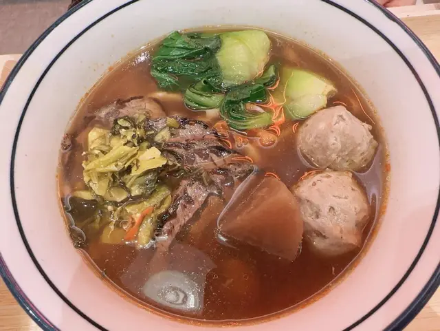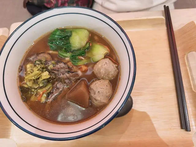用牛骨,牛油,蘿蔔熬製嘅湯底,十分入味,滷牛腱稔香軟彈,濃汁牛筋丸爽彈鮮美,蘿蔔爽口微彈,完全吸收了湯底的味道,十分入味,醃酸菜,扁面軟彈煙韌