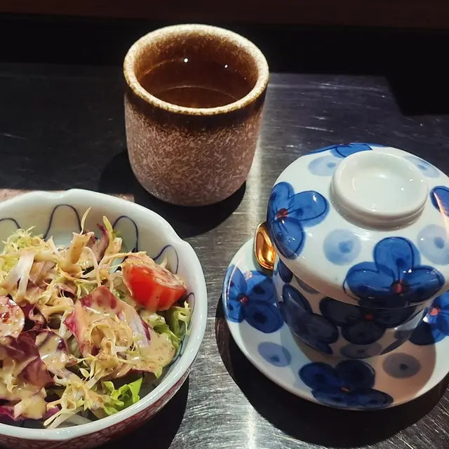 沙律菜超fresh🥗,配日式麻醬冇得輸;茶碗蒸雞蛋幼滑,配料有菇🍄🟫、蟹肉🦀、嗚門卷🍥;套餐跟沙律、茶碗蒸、麵豉湯,仲可以半價加配無酒精飲品。