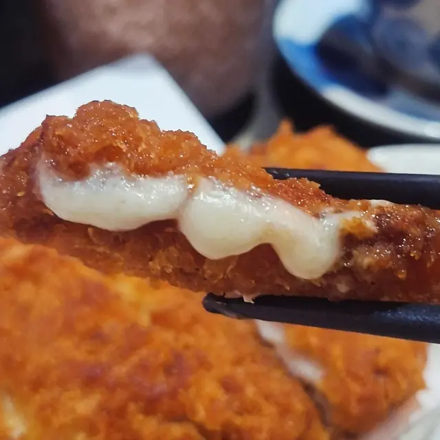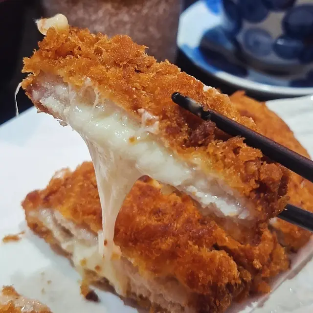 吉列豬扒大大塊,炸到金黃色,外脆肉嫩,香脆可口,中間夾住芝士,芝士呈流心拉絲,邪惡之極🤤。