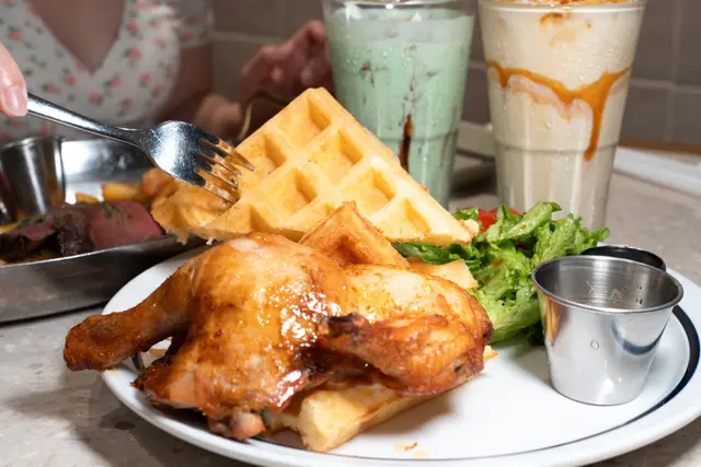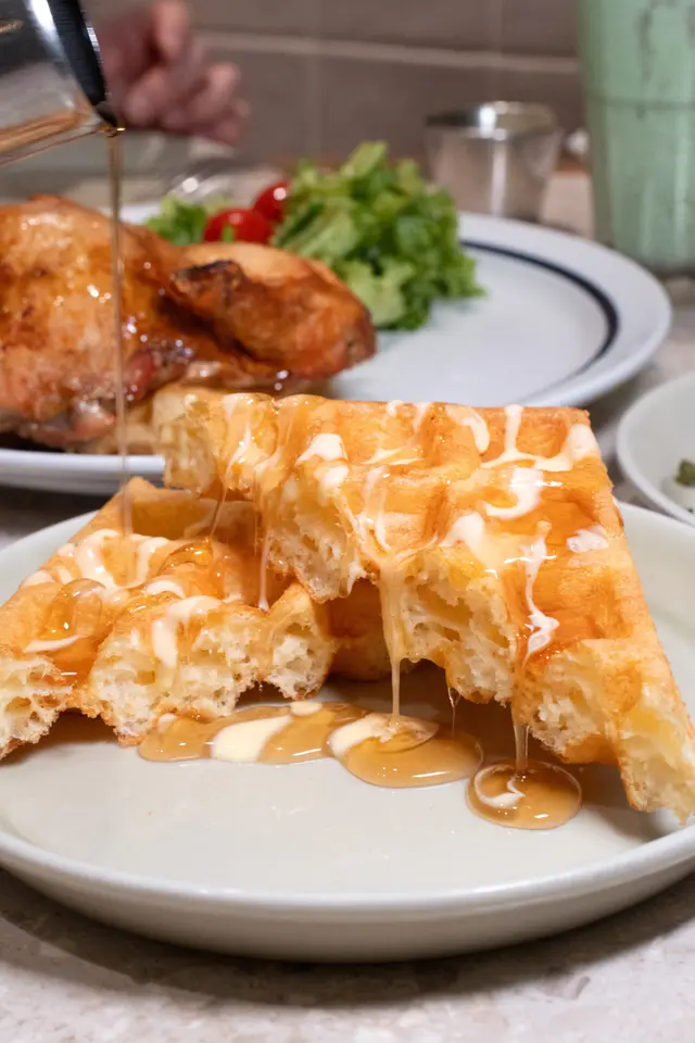 窩夫外脆內軟,澆上蜂蜜和奶油,香甜在舌尖散開。