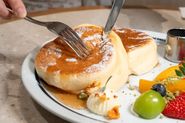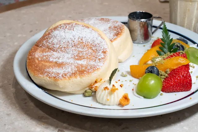 鬆餅鬆軟得像雲朵,淋上琥珀色糖漿,入口即化,旁邊還有新鮮水果,酸甜解膩