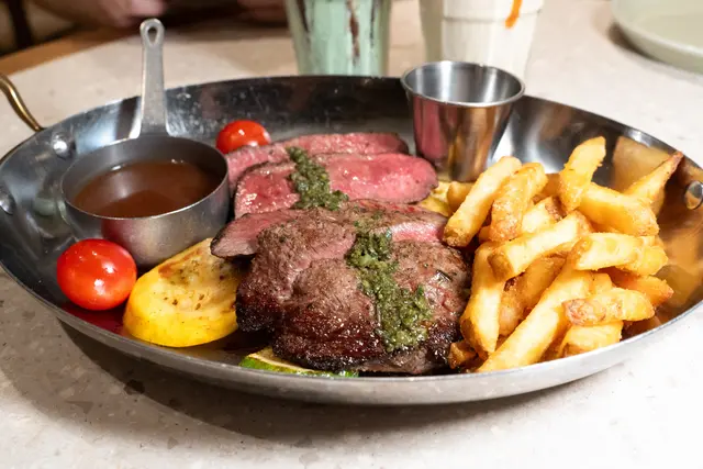 牛排熟度剛好,肉質軟嫩,外皮帶著微微焦香,搭配的薯條金黃酥脆,搭配的特製青醬,讓牛肉的鮮味更上一層樓