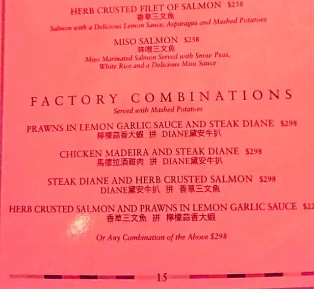 「馬德拉酒雞肉拼DIANA黛安牛扒」亦上桌,兩大隻碟將餐桌迫滿了,個人的餐碟只有迫到極邊緣來,為什麼要我們吃得有如困獸鬥!這個什麼馬德拉酒雞,雞肉根本沒味,亦嚡,毫不吸引,那個馬德拉酒做的汁更帶酸味,一點也不覺得好吃,牛扒切好了五片,說好了要五成熟,一口吃下,就只是覺得嚡,靭,牛味尚濃,吃到的感覺就是起碼有八成熟,失望!