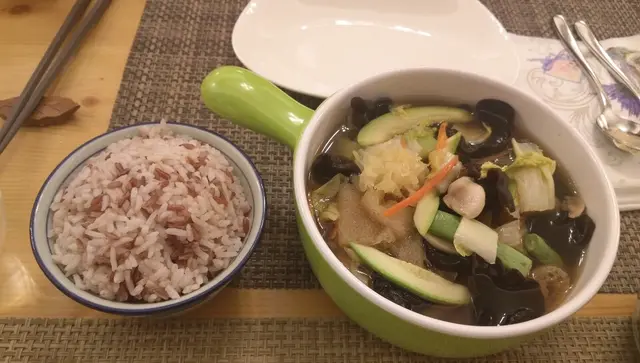 朋友叫左養生煲配紅米飯,好多蔬菜,味道正常。(雲耳,竹笙,翠玉瓜,豆,菇)