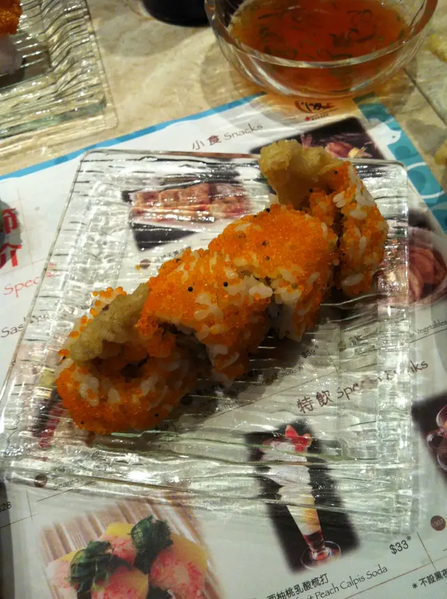 軟殼蟹天婦羅, 炸得唔錯, 粉唔會太厚, 亦唔會好油, 不過平常ge 日式料理店, 通常個天婦羅汁係配蘿蔔蓉, 但呢度用上左一款紅色ge 蓉, 唔知咩黎, 點左, 味道一般, 有少少酸味