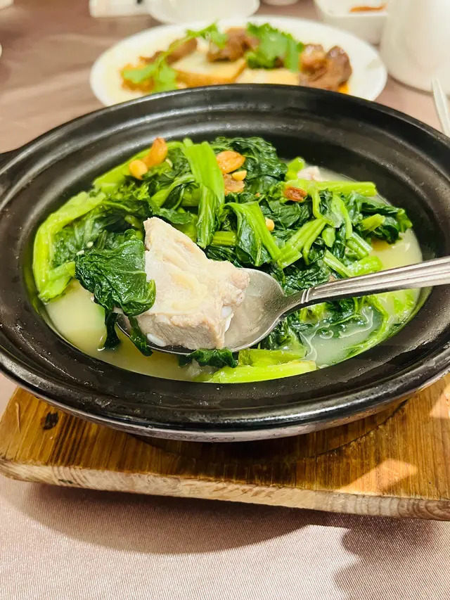 此菜配搭豬骨等煲製,湯底呈乳白色,應屬長時間熬煮,豬骨炆得夠腍,而且有啲肥肉又唔鞋口。不過其實個湯底有啲似雲吞雞煲。煲身細小,性價比稍遜。