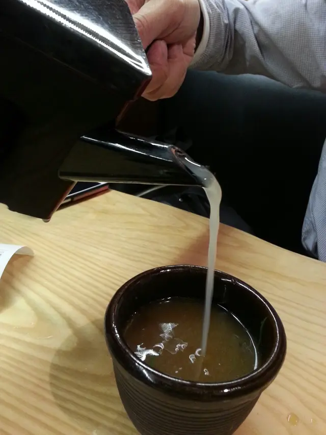 店員中途送上蕎麥麵的湯,用於最後加人醬汁內,一起飲。知道蕎麥麵的湯好健康,但不太喜歡這個味道。